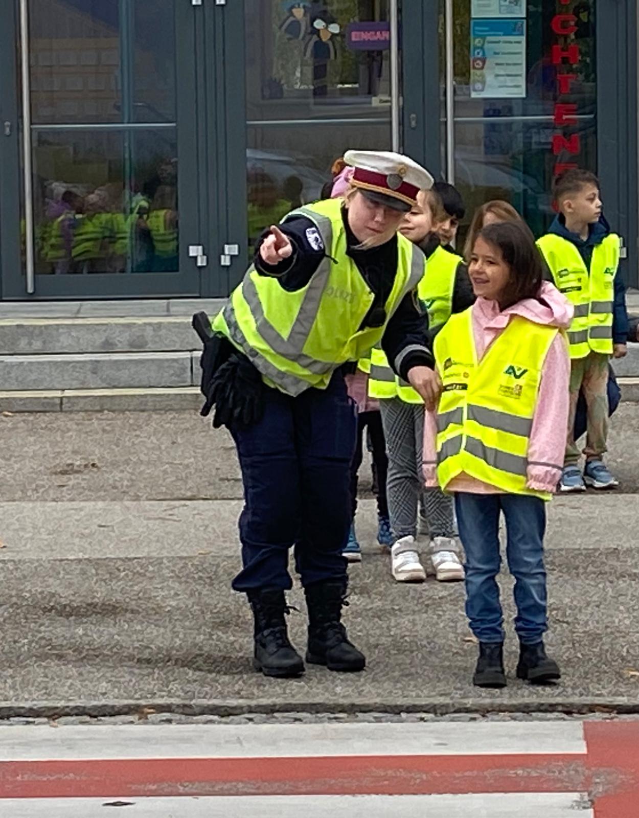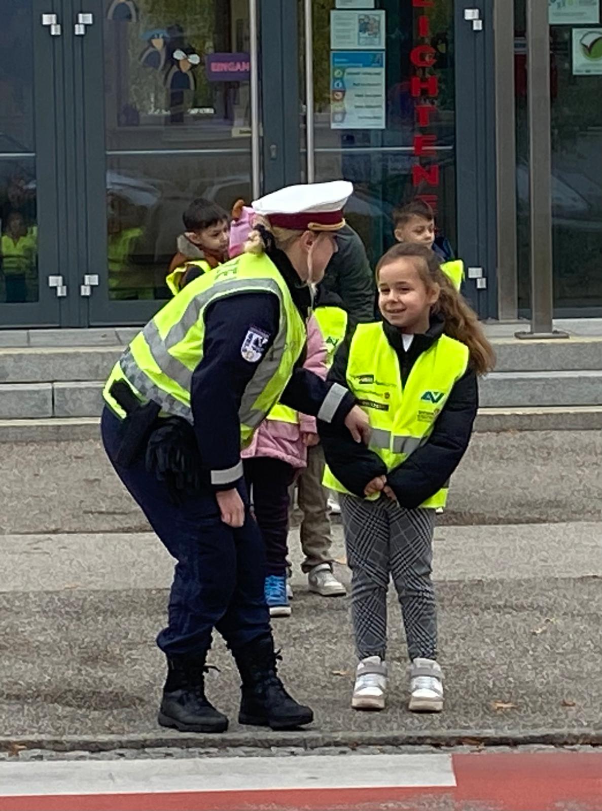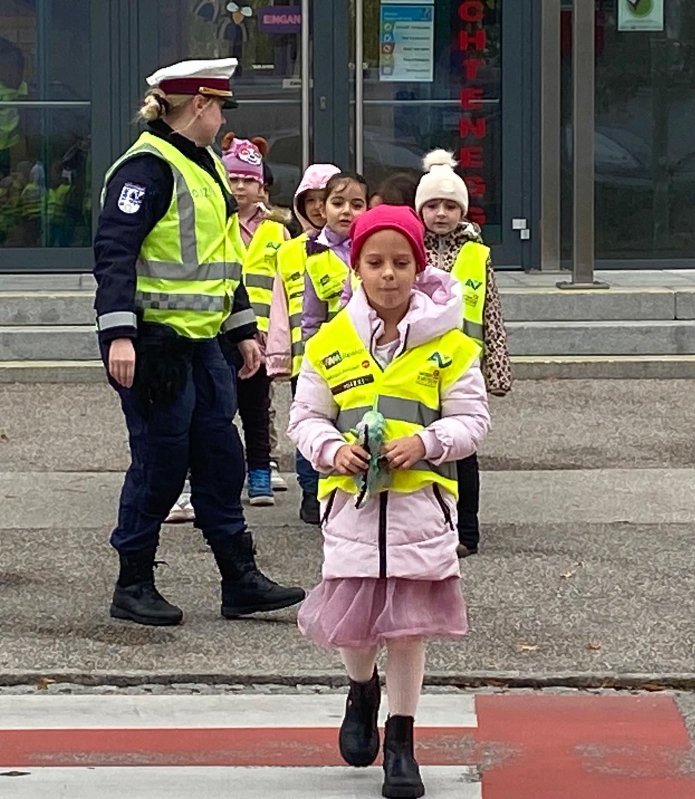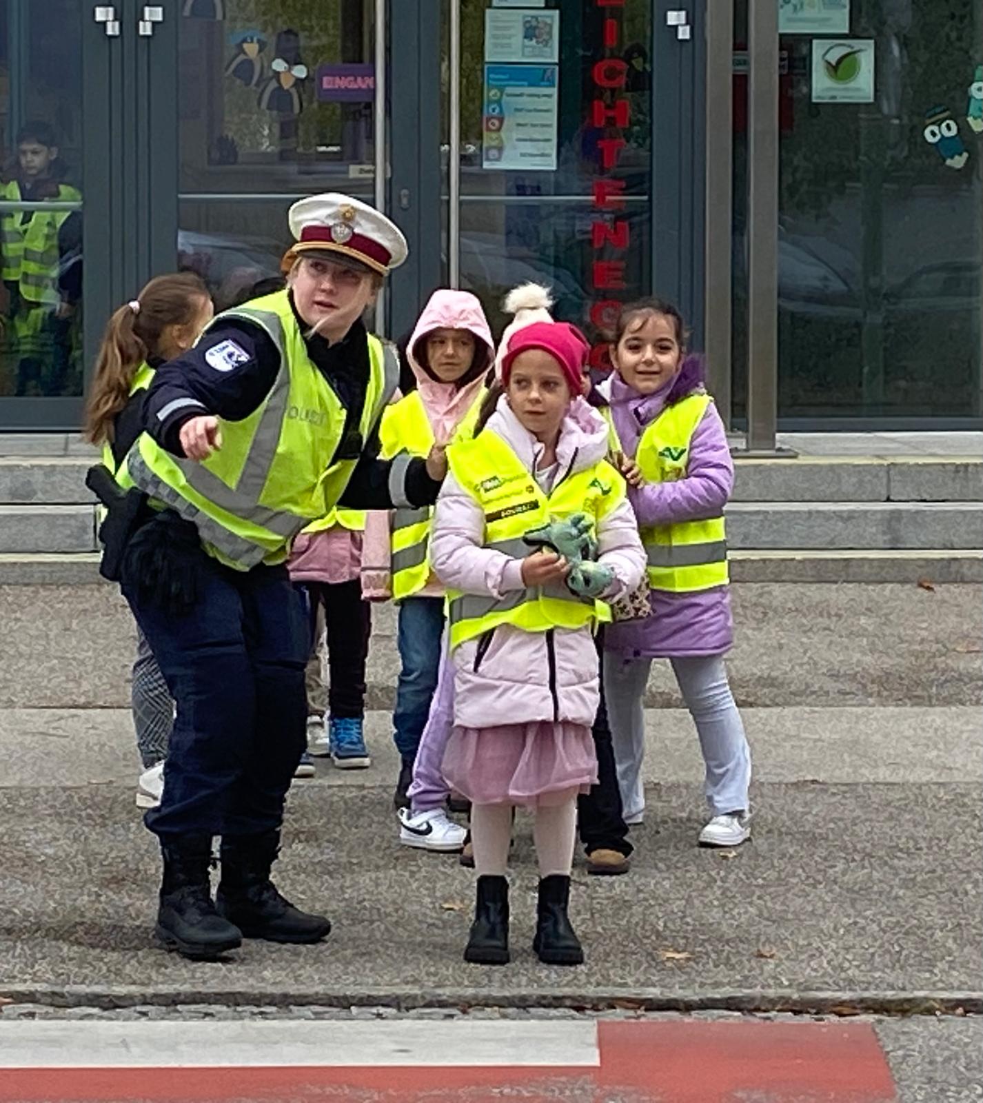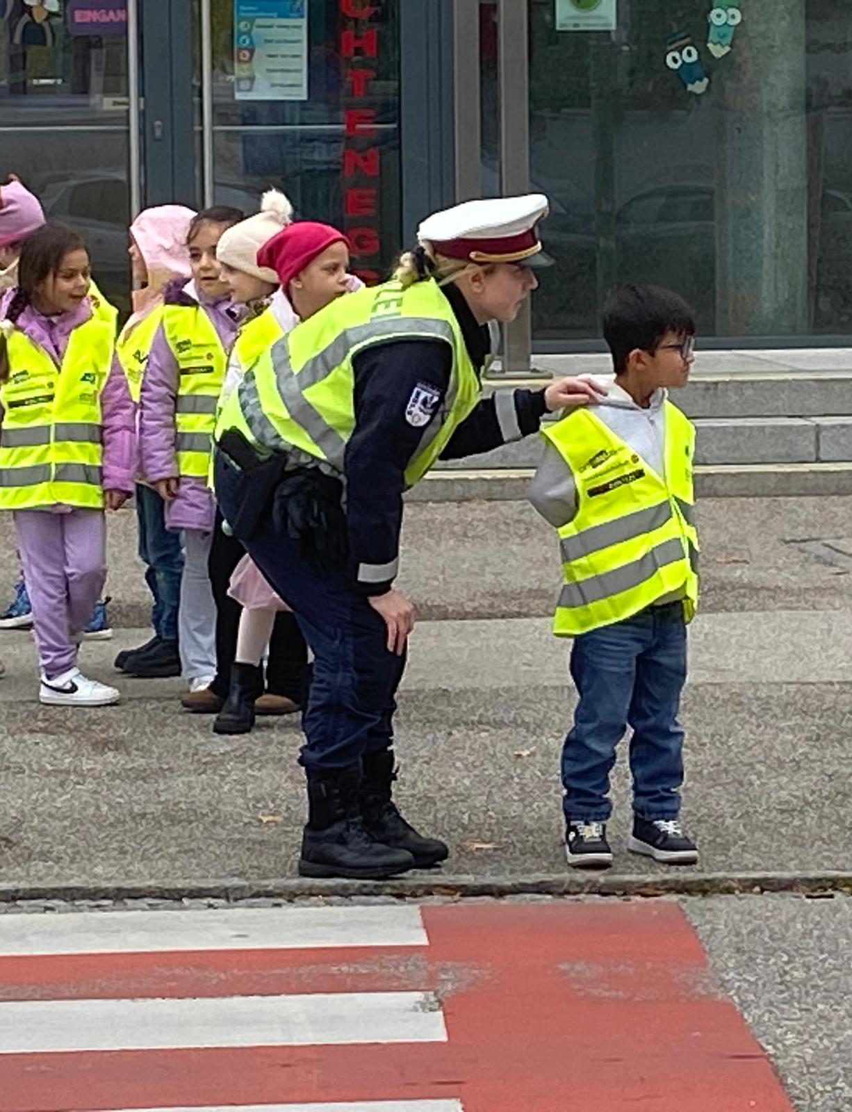 Am 22.10. hatte die 1b ganz besonderen Besuch: Eine echte Polizistin war bei uns! Gemeinsam haben wir geübt, wie man richtig und sicher über die Straße geht – mit Ampel, Zebrastreifen und ganz viel Aufmerksamkeit. Dabei haben wir auch gelernt: Nicht alle Autofahrer sind so aufmerksam wie wir! Manche sind einfach weitergefahren, obwohl eine ganze Gruppe Kinder mit einer Polizistin vor dem Zebrastreifen stand! Aber keine Sorge – unsere Polizistin blieb cool, zückte ihr Notizheft und sorgte für „pädagogisch wertvolle“ Lerneffekte… zumindest für die Autofahrer.